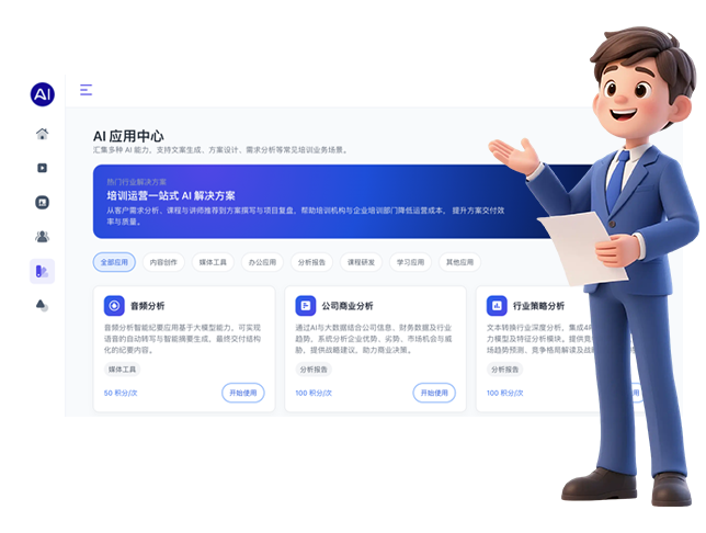 从培训从业者的实际工作场景出发,提供“智能工具+丰富资源”的双重赋能。将重复性工作压缩至分钟级,内置持续更新的课程内容、最佳实践案例库及配套教学素材,将更多精力聚焦于核心创意与价值创造。