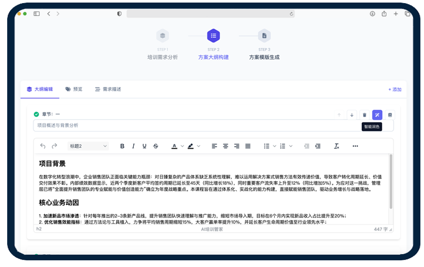 AI基于柯氏四级的评估体系生成专业方案大纲,章节小节一目了然,自动填充章节的内容。一键匹配课程内容和师资,告别挨家询价、东拼西凑繁琐的流程。