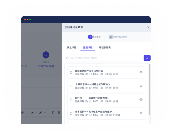 根据方案内容、培训目标、学员层级等,自动从平台精品课程库中匹配最合适的课程;同时结合需求中明确的预算范围,智能控制推荐课程的数量与类型,确保不超支、不跑偏。一套与方案高度匹配、预算可控、可直接落地的课程清单。不用挨家询价,不用东拼西凑。方案交上去,课程就能跟得上。。