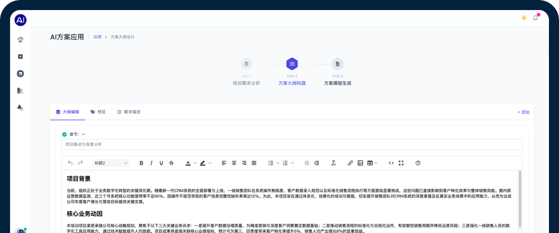 您只需:基于需求总结和要求,培训管家自动生成初版方案大纲,并填充每一个章节的初始化内容,您在编辑界面自由调整——增删章节、修改标题、调整顺序,直到完全符合您的思路。您获得:一份由您亲手打磨的方案骨架。先定结构再写正文,避免写到一半发现方向不对、推倒重来的痛苦。改大纲比改长文省时百倍。
